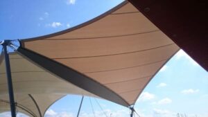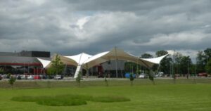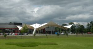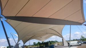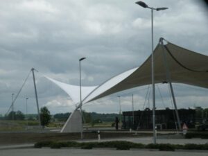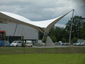 Die Hauptmembrane mit einer Größe von 2000qm wurde aus einem PVC-beschichteten Polyestergewebe in Type IV gefertigt. Aufgrund des direkten Anschluss am Bestandsgebäude wurde hier aus Brandschutzgründen ein weiteres 120qm großes Segel aus einem nicht brennbaren PTFE-beschichteten Glasfasergewebe installiert. Die PVC- und die PTFE-Membran wurde mit einem Auge verbunden, um auch hier keinen Wasserdurchlass zu ermöglichen.