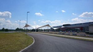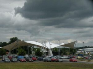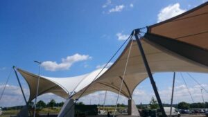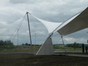 Die Membrankonstruktion überdacht eine Gesamtfläche von 2120qm und wird von 2 gebogenen Rundstahlbögen mit einer Länge von jeweils 40m und 2 unterstützenden S-Seilen in Position gehalten. Die weiteren Abspannpunkte bilden 7 Stützen mit Längen von über 14m. Bei diesem Projekt wurden insgesamt 625m Drahtseile mit Durchmessern von 20-40mm eingesetzt.