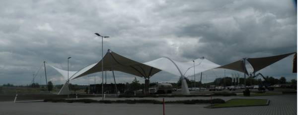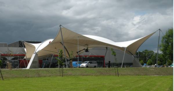 Die Hauptmembrane mit einer Größe von 2000qm wurde aus einem PVC-beschichteten Polyestergewebe in Type IV gefertigt. Aufgrund des direkten Anschluss am Bestandsgebäude wurde hier aus Brandschutzgründen ein weiteres 120qm großes Segel aus einem nicht brennbaren PTFE-beschichteten Glasfasergewebe installiert. Die PVC- und die PTFE-Membran wurde mit einem Auge verbunden, um auch hier keinen Wasserdurchlass zu ermöglichen.